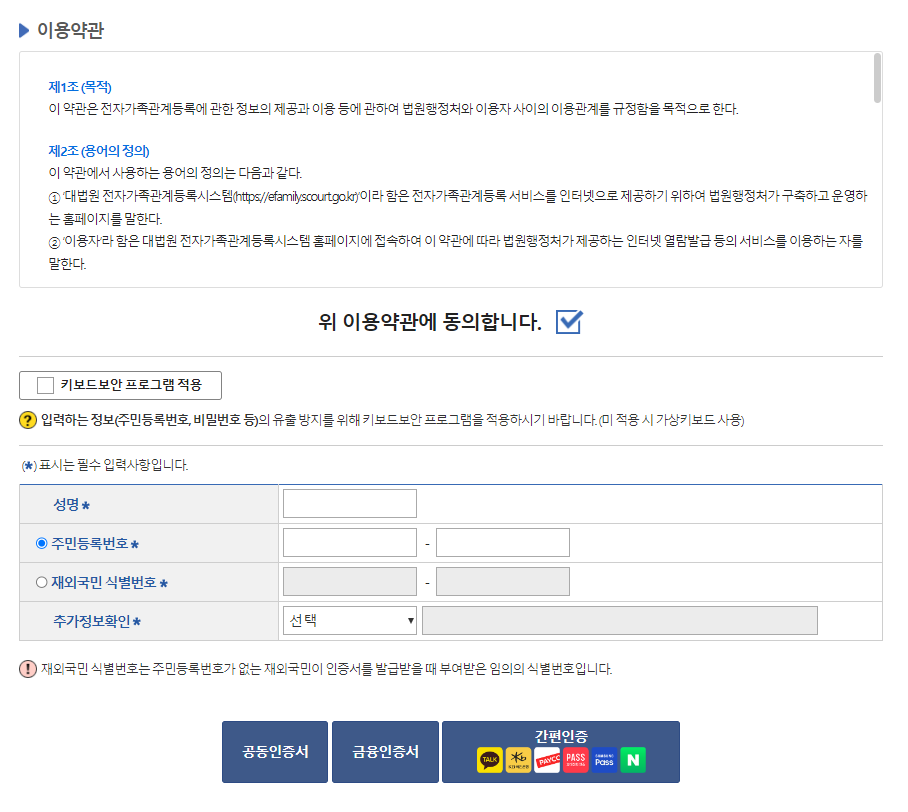 3. 이용약관에 동의하신 후, 이름과 주민번호를 입력 합니다. 공동인증서나 금융인증서로 개인인증을 진행합니다.