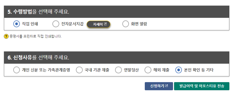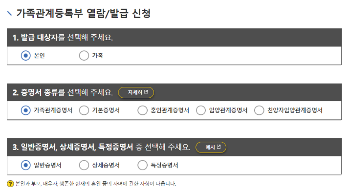 5. 가족관계증명서 인터넷발급 세부항목 선택