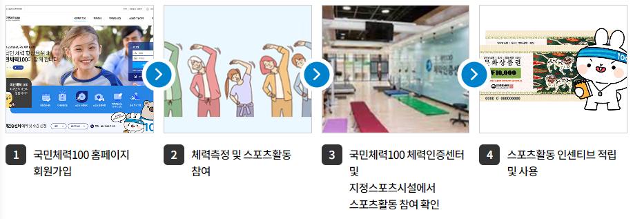 국민체력100의 다채로운 체력관리 서비스와 스포츠활동 참여후 인센티브를 지급하고 리워드상품(문화상품권)으로 교환할 수 있는 대국민 체력 증진을 위한 서비스 입니다. (6월이후는 문화상품권을 스포츠상품권으로 변경 예정)