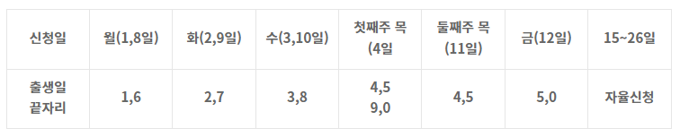 * 신청시작 2주간(5.1~5.12) 출생일 기준 5부제를 적용