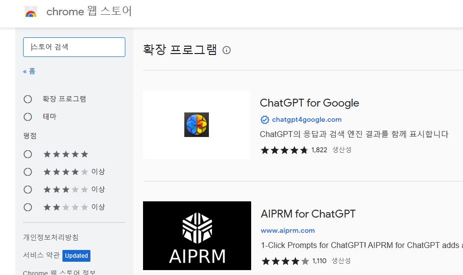 AIPRM는 프로젝트의 일정, 업무 분배, 리소스 관리 등을 자동화하며, ChatGPT를 이용하여 자연스러운 대화의 진행이 가능합니다. 이 AIPRM은 우리가 ChatGPT에서 원하는 답변을 효율적이고 정확도 있게 얻어내기 위해서 입력해야 하는 문구들을 정형화시켜놓은 프롬프트들이라고 보시면 되겠습니다. AIPRM은 ChatGPT의 능력을 최대치로 이끌어 낼 수 있는 애플리케이션이라고 볼 수 있을 것입니다. AIPRM for ChatGPT의 설치 방법도 동일합니다. 크롬 검색창에 'AIPRM for ChatGPT'를 입력 후 나오는 결과를 클릭하고 '추가' 버튼을 통해 애플리케이션 설치를 완료합니다.